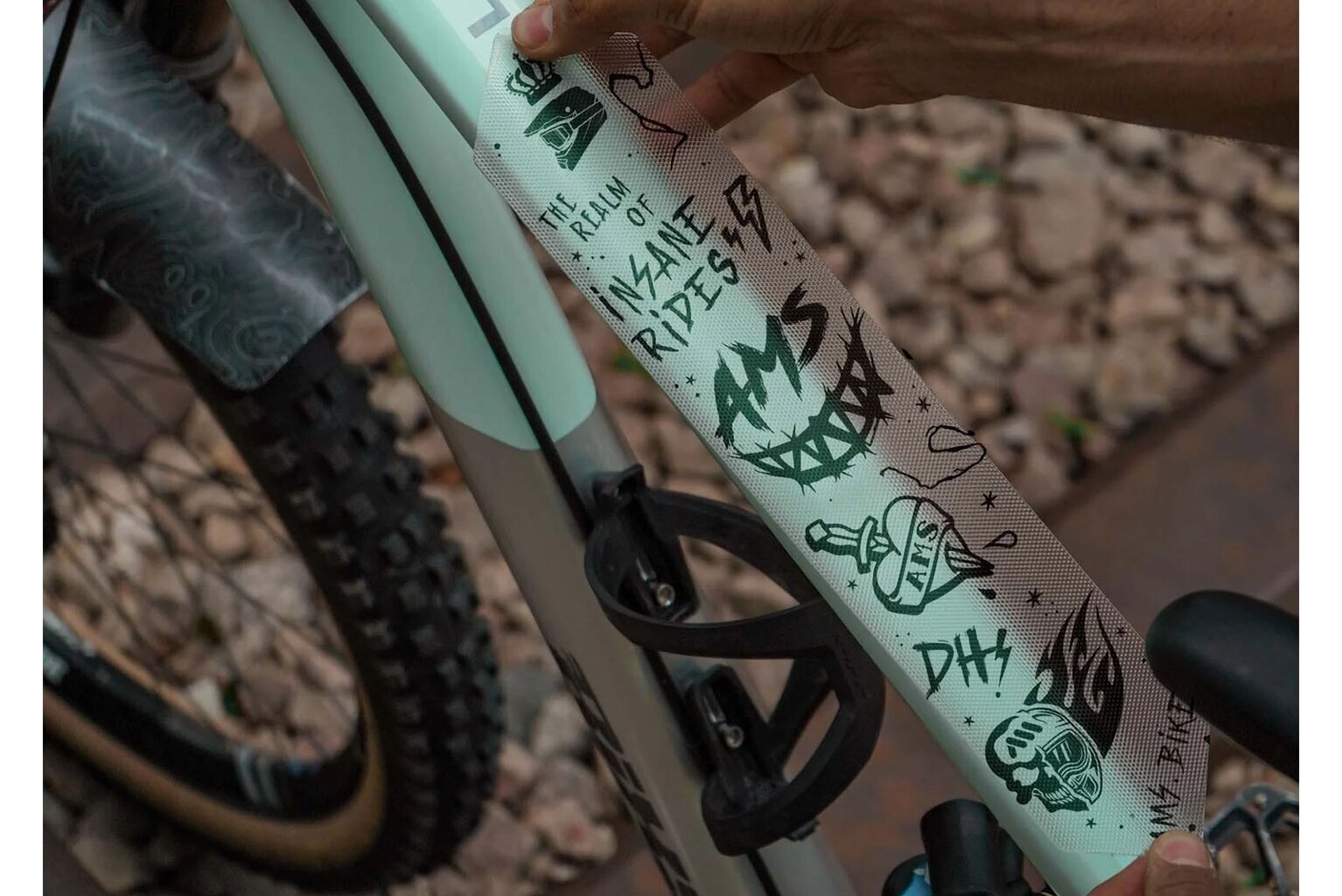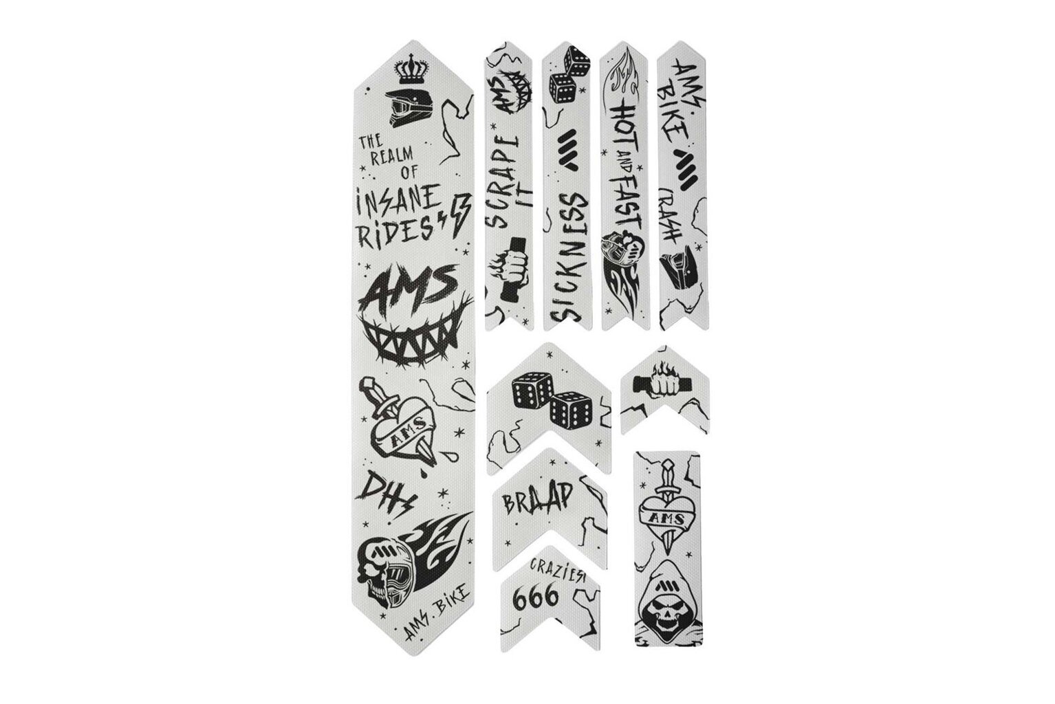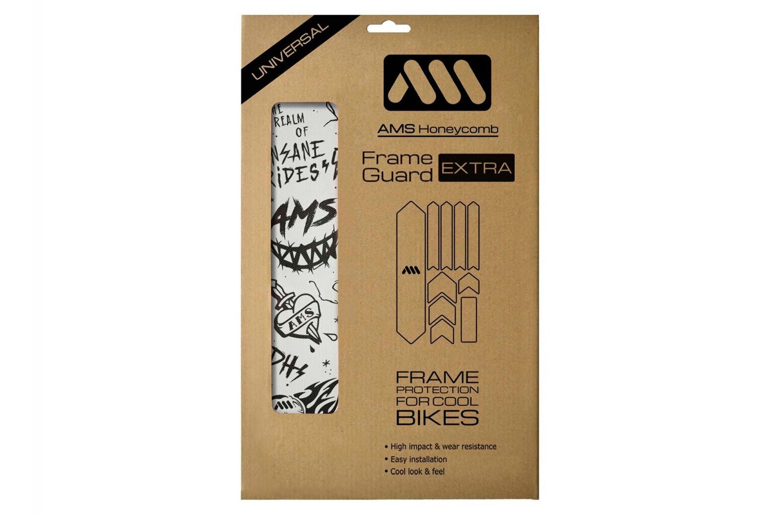All Mountain Style (AMS) protective and design decal in EXTRA size not only protects bike frames from impacts, scratches, and cable wear but also allows you to customize the look of your bike. It is made from exclusive, easy-to-install honeycomb PVC with a high-quality adhesive. This material lasts longer than your bike. When replaced, no adhesive residue remains on the frame, as the decal peels off along with the adhesive.