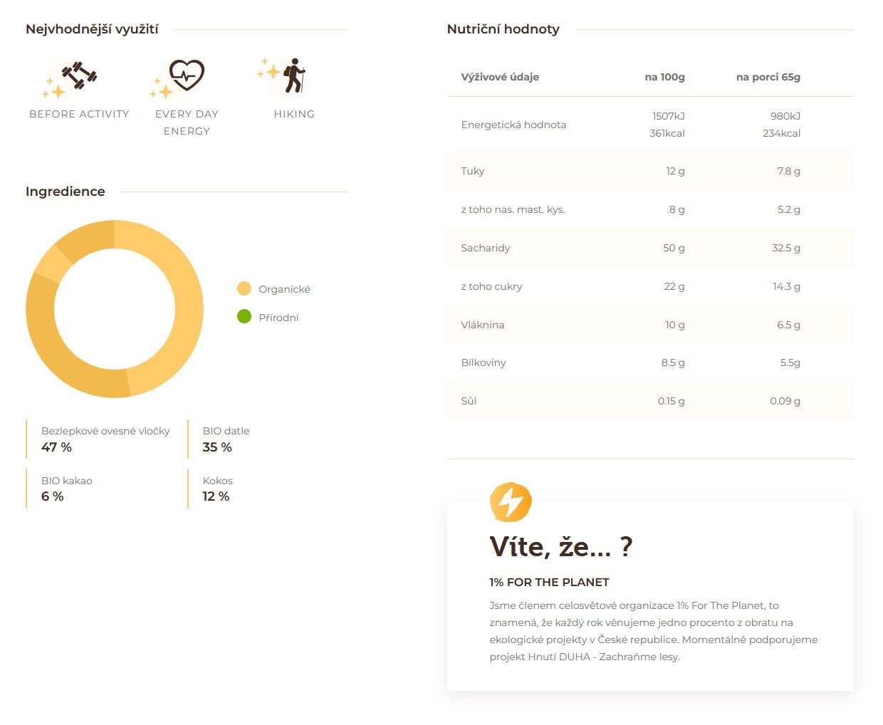 | Nutritional information | per 100g | per serving 65g | |