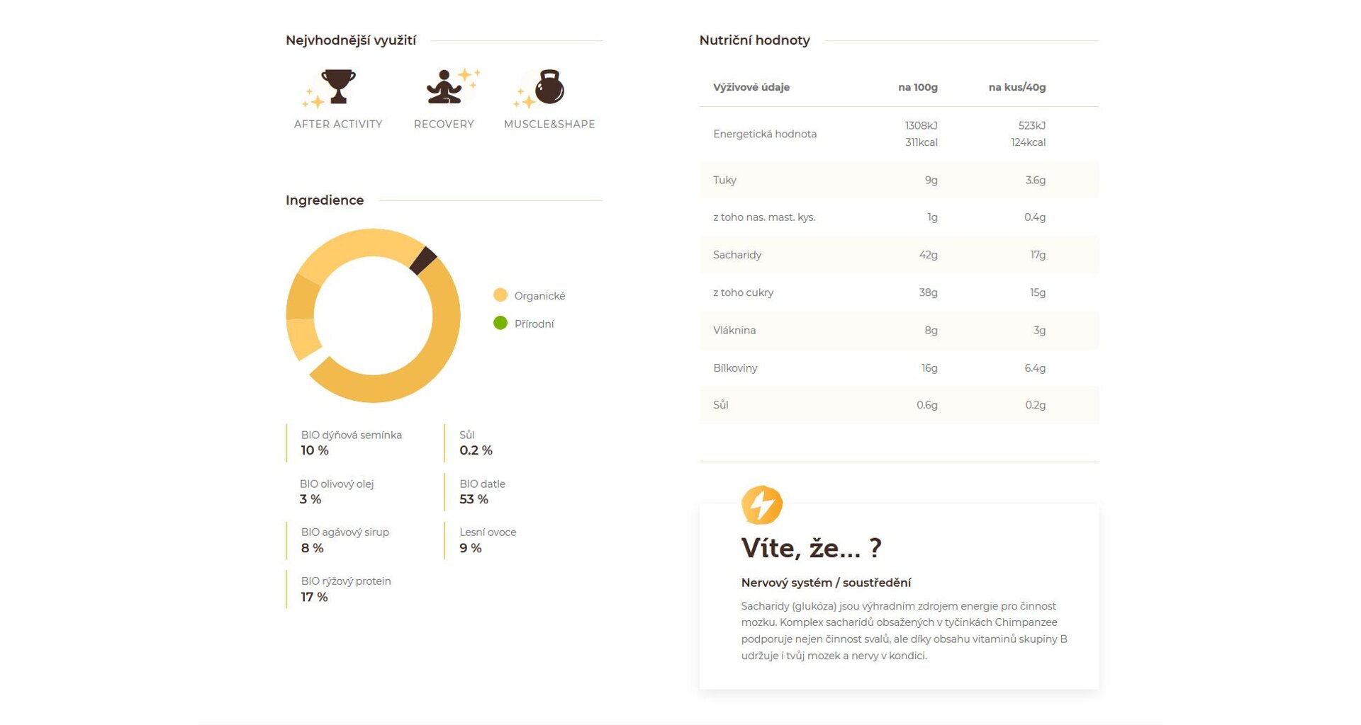 Chimpanzee Energy bars are sweetened with BIO quality rice syrup. You will not find any glucose-fructose syrup or refined sugar with us. Due to its composition (maltose, glucose and polysaccharides), rice syrup has a lower glycemic index, contains B vitamins and minerals such as potassium, magnesium, zinc and manganese.