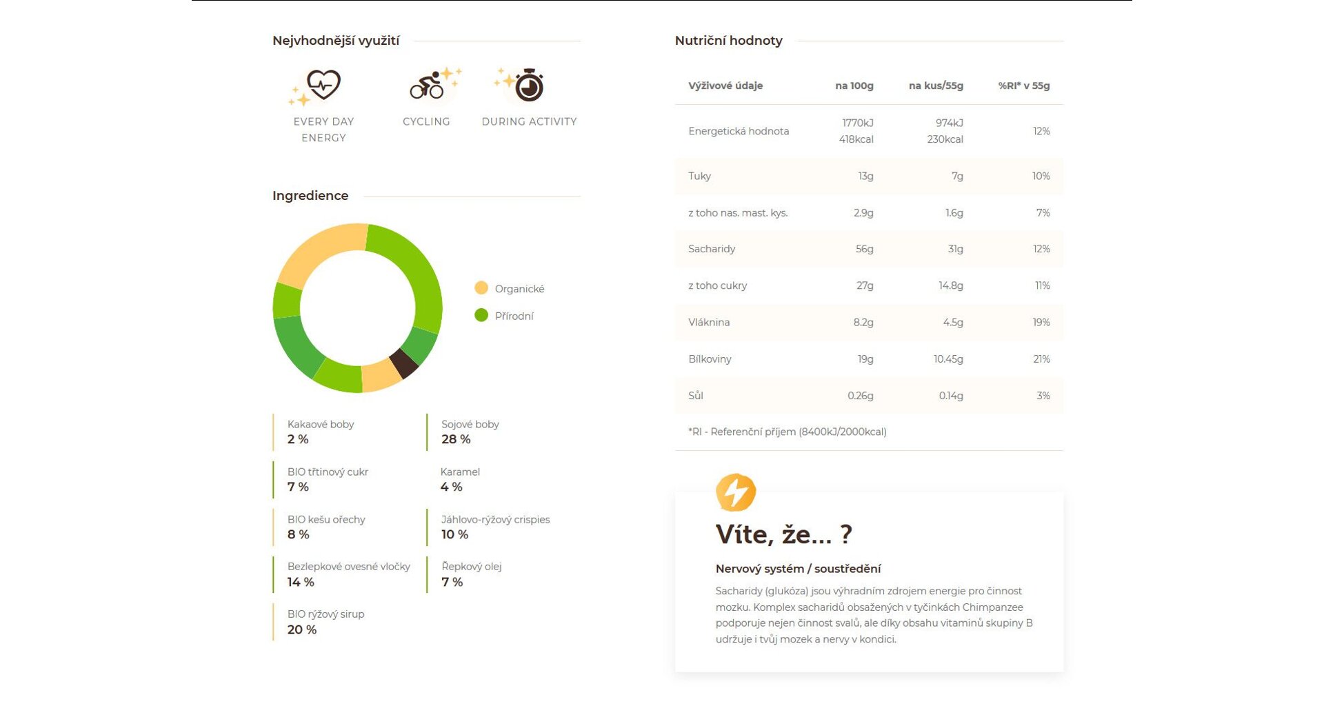Chimpanzee Energy bars are sweetened with BIO quality rice syrup. You will not find any glucose-fructose syrup or refined sugar with us. Due to its composition (maltose, glucose and polysaccharides), rice syrup has a lower glycemic index, contains B vitamins and minerals such as potassium, magnesium, zinc and manganese.