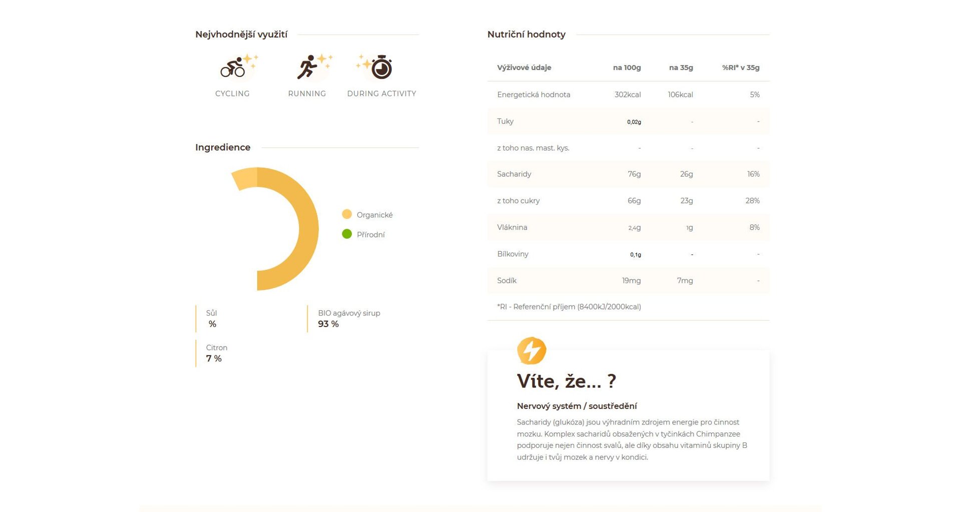 Chimpanzee Energy Gels are made from 90% bio agave syrup. Its advantage is a low glycemic index and efficient absorption in the digestive tract. In combination with 100% fruit concentrates (chocolate), without additional added sugars, flavours, and colours, Chimpanzee Energy Gel forms a simple solution to replenish instant energy during sports performance. The Energy Gels are intended for performance athletes, cyclists, runners or triathletes. However, they can be consumed by anyone who needs a fast and high-quality source of energy.