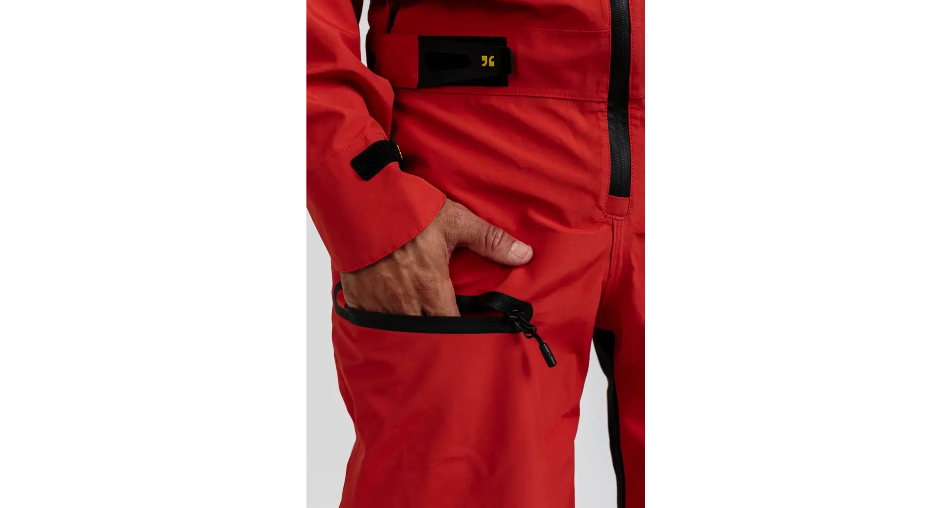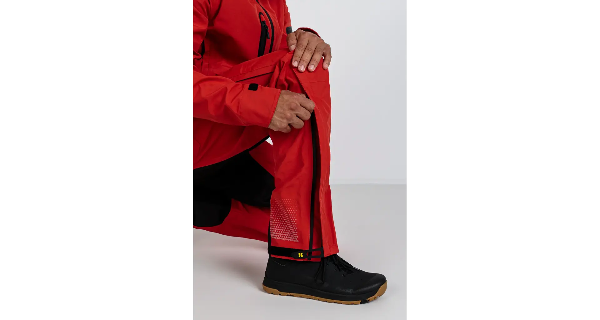 The long legs make it the perfect winter companion for the cold, wet season. Long side zippers on the legs allow access to knee pads. Numerous air inlets facilitate easy temperature regulation and make the suit comfortable to wear for extended periods. Reflective elements on the back and legs provide additional visibility from behind.