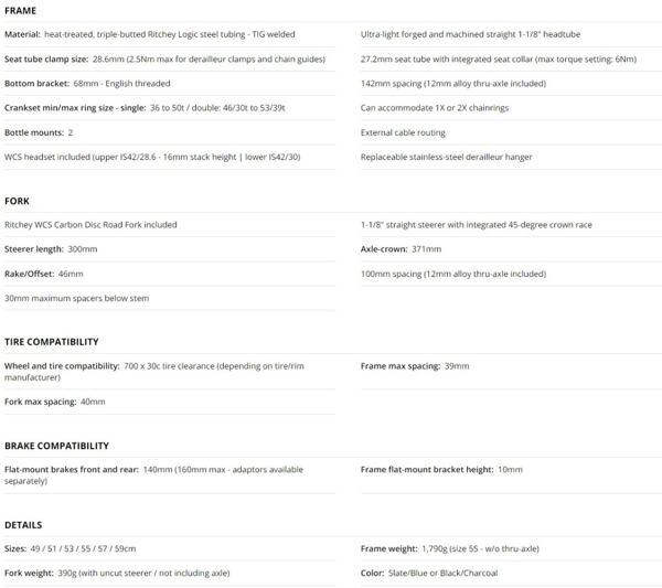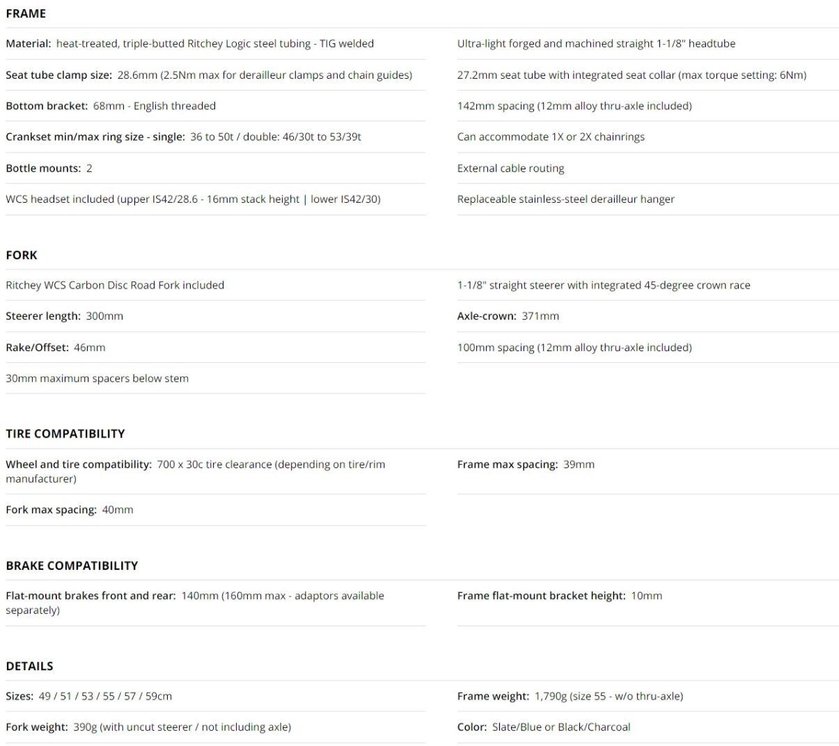 The frame is built with a heat-treated and triple-butted proprietary Ritchey Logic tube set and features a straight headtube and aggressively short-butted sections optimized for TIG welding that save weight and improve ride quality. The tried and true specs on the frame remain unchanged but now sport a redesigned chainstay for flat-mount disc brake compatibility, thru-axles in the front and rear and a new fork designed specifically for the Road Logic Disc.
