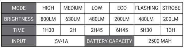 Front light with 800 lumens and 6 lighting modes. The Focus 800 allows you to change the shape of the light beam using a rotating front lens. You can choose between a low or high beam depending on the situation you are riding in. The lens shape is also optimized for side visibility. The light is water-resistant (IP66) and can also be used as a power bank. Thanks to the 2500mAh battery, it lasts up to 13 hours of operation depending on the selected mode. The Focus 800 is easily mounted on or under the handlebars using a mount with Velcro straps. The straps are also rubberized, so the light stays firmly in place.