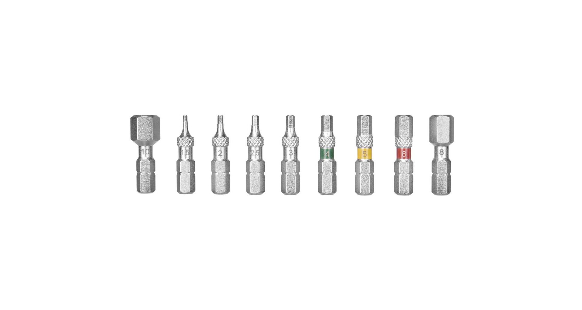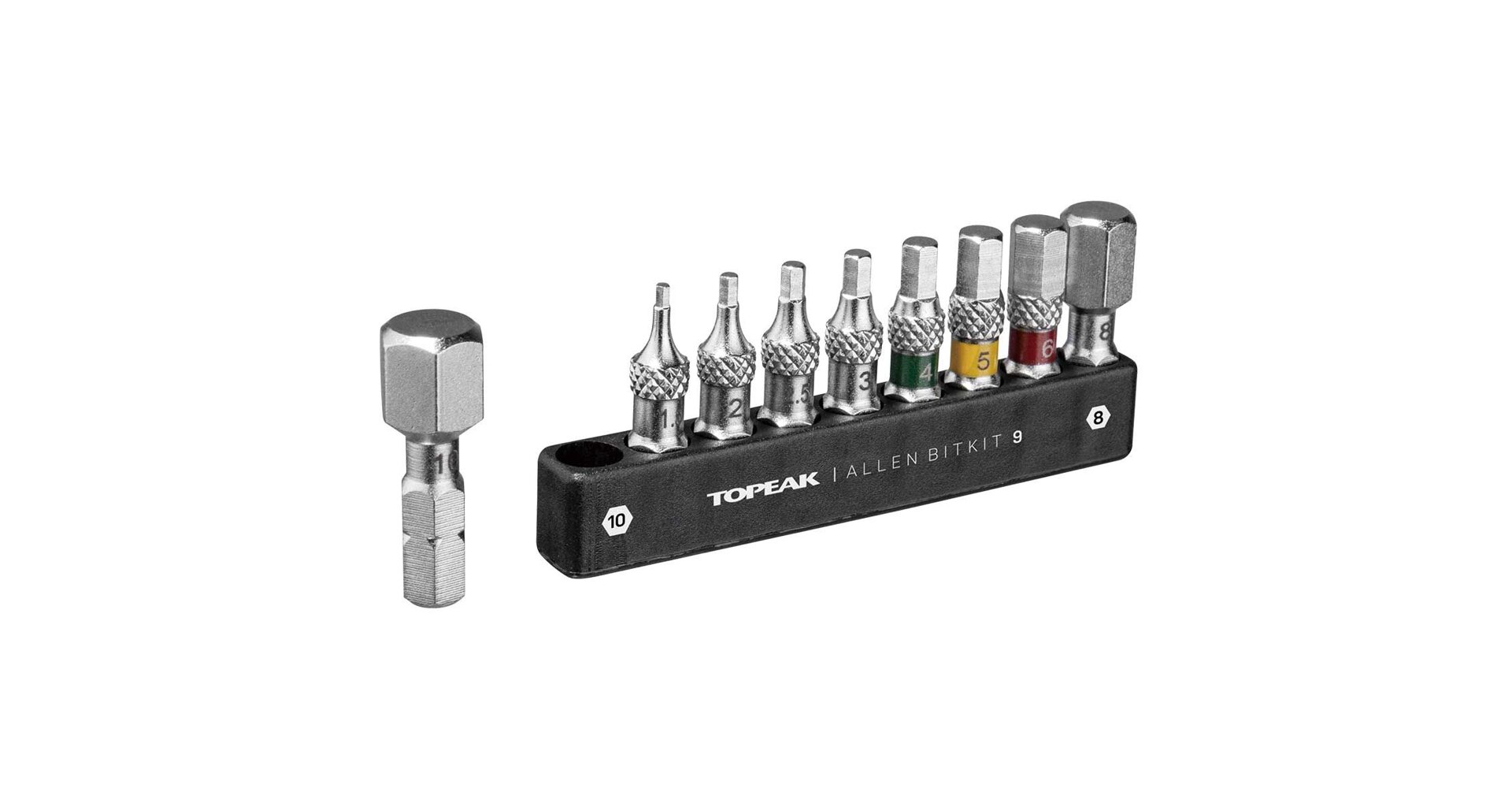 A complete 9 piece Allen bit set for road and mountain bike repair and maintenance. Designed to work with all Topeak ratchets and torque wrenches as well as other brand ratchets and bit drivers. Generous 30mm bit length makes it easy to reach tough bolt locations and knurling prevents fumbling when changing bits or removing bits from the organizer.