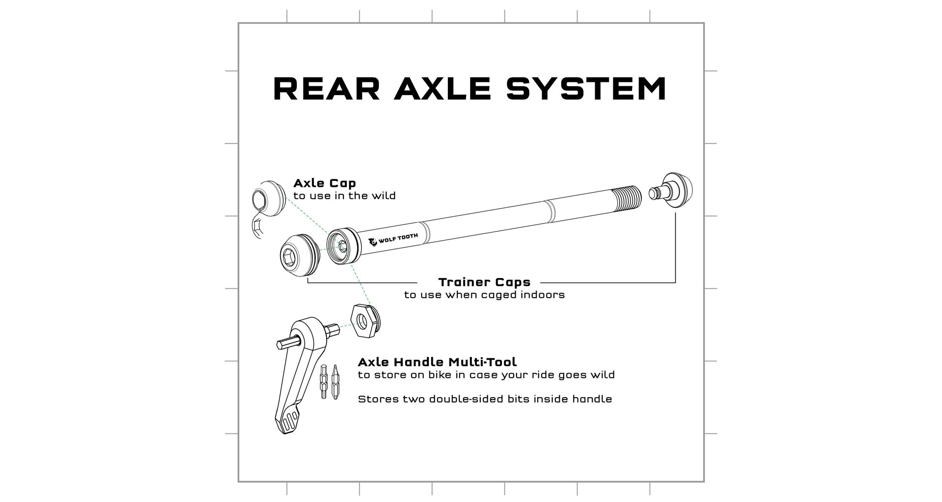 - Designed for Wolf Tooth rear axles with a female threaded head-end but also compatible with axles from Trek and other manufacturers that have a removable handle retained with an o-ring"