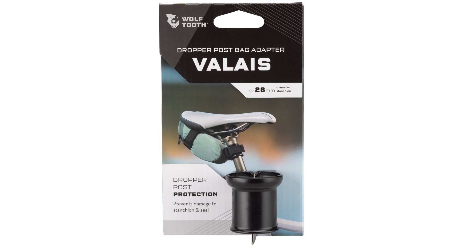 The Valais 25 is an adapter that allows the use of a seat bag with a dropper post. The Valais mounts to the stanchion (upper post section of a dropper post), providing a secure mounting point while protecting the stanchion from wear and the wiper seal from damage.